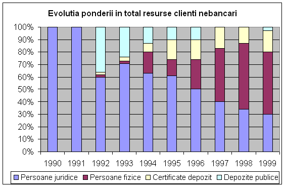 ● resursele atrase de la persoanele juridice au inregistrat o reducere a ponderii in total resurse in lei de la 57,9% la 31.12.1990 ca urmare a cresterii treptate a altore fonduri apartinand clientilor nebancari, precum cele atrase de la persoane fizice. De asemenea, maturitatea acestor resurse a inregistrat o crestere ca urmare a majorarii continue a volumului depozitelor la termen de la 2,2% la 31.12.1992 la 12,3% la 31.12.1999 (ponderi in totalul resurselor in lei), ceea ce a condus ca in prezent sa se inregistreze o pondere aproximativ egala a resurselor atrase la termen si respectiv la vedere de la persoanele juridice;