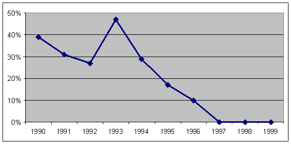 ● depozitele publice au fost constituite in special pe baza unor reglementari si baze normative. Va urmare a evolutiei volumului de resurse atrase de la persoanele fizice si juridice, ponderea in total resurse in lei detinute de depozitele publice s-a diminuat treptat, de la 17,1% la 31.12.1992 la 2,9% la 31.12.1999. Evolutia ponderii in total resurse in lei transformate in echivalent U.S.D. a resurselor atrase de la clienti bancari in perioada 31.12.1990 - 31.12.1999, este prezentata in graficul urmator: