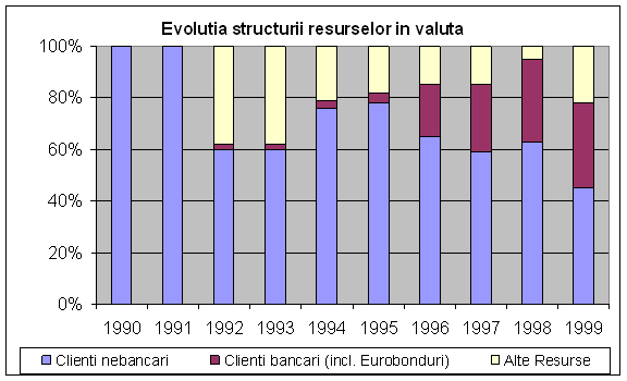 Spre deosebire de resursele in lei, resursele In valuta atrase de banca s-au bazat in mare majoritate pe cele provenite de la clienti nebancari, mentinandu-se in toata perioada scursa de la infiintarea B.C.R. si pana in prezent la un nivel de peste 50% in totalul resurselor in valuta ale bancii.