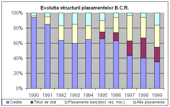 Din analiza evolutiei, se remarca la finele anului 1999 o structura echilibrata a plasamentelor bancii, structura total diferita de cea inregistrata in primii ani de activitate in care plasamentele in credite depaseau doua treimi din totalul plasamentelor B.C.R.. Concomitent cu acumularea de resurse in valuta, s-a diminuat ponderea in totalul plasamentelor de peste 67% detinuta de creditele in lei la 31.12.1992 prin cresterea treptata a ponderii creditului in valuta de la 0,6% la 31.12.1992 la circa 15% la 31.12.1999 in conditiile in care creditul in lei detinea o pondere apropiata, de circa 19% la finele anului 1999.