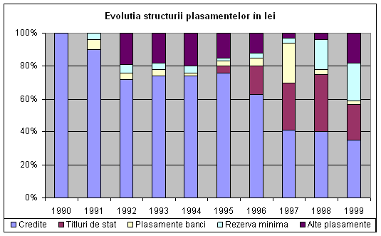 Evolutia structurii plasamentelor in lei in perioada 31.12.1990 - 31.12.1999 este prezentata in graficul urmator: