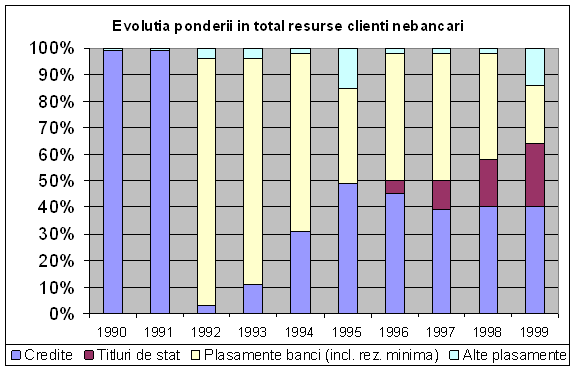 Continua consolidare a resurselor atrase in lei de la clienti nebancari in perioada 31.12.1995 - 31.12.1999 a generat o independenta de resursele atrase de la banci - resurse cu costuri ridicate si termene reduse. Este de remarcat nivelul constant ridicat al resurselor atrase de la persoane juridice si fizice, de peste 80% din totalul resurselor in lei inregistrat in ultimii 3 ani, ceea ce a conferit o stabilitate superioara resurselor detinute de banca. Evolutia ponderii in totalul resurselor in lei atrase de la clienti nebancari, a celor detinute de persoanele fizice si juridice, certificate de depozit si depozite publice, este prezentata in graficul urmator: