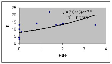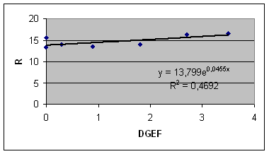 Din reprezentarea grafica se constata ca pentru valori ale lui R<10% scaderea indicelui GEF este de <0,5 puncte, pe cānd pentru valori mai mari de 10-12% ale lui R scaderea indicelui GEF este mai mare de 1,5 puncte.