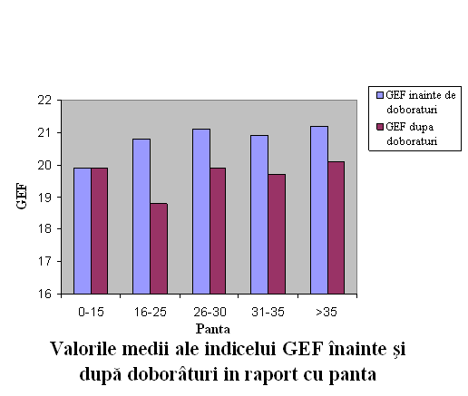 Īn cazul categoriilor de panta 26-30 grade si >35 grade, scaderea indicelui GEF a fost īn medie de 1 punct, valoarea acestui indice mentināndu-se īn domeniul optimal inferior.