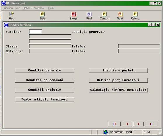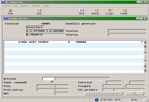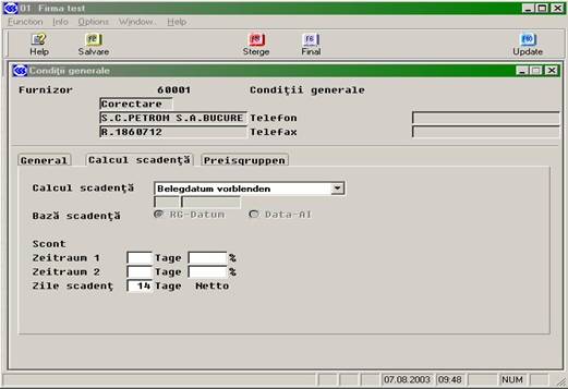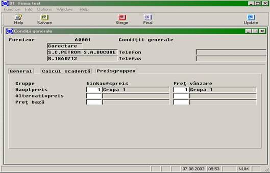 În conditii generale (EK2120) se introduc informatiile generale legate de furnizor, scadenta si grupele de pret (vezi imaginile urmatoare):
