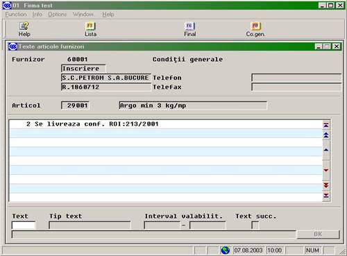 Textele articole-furnizori (EK021AT) ofera posibilitatea de a asocia texte standard la fiecare articol din comanda (specificatii observatii).