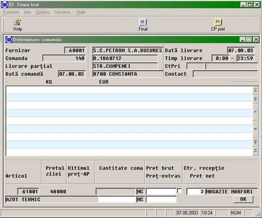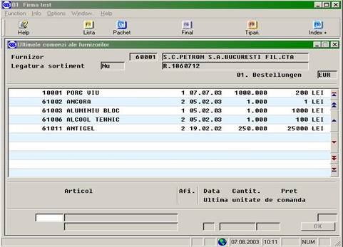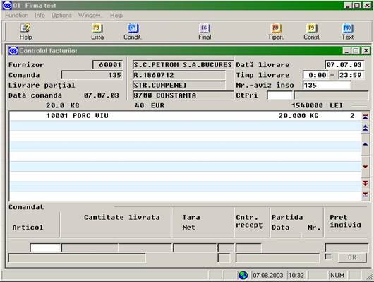 Se alege furnizorul, apoi pe câmpul de comanda (vezi figura urmatore) se tasteaza F3 pentru a obtine lista intrarilor efectuate, din care se selecteaza comanda la care dorim sa înregistram factura.