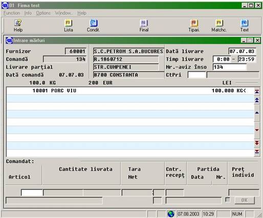 Preluarea marfurilor de la furnizor se face în intrare marfuri (EK023), pe baza comenzilor. La cântarirea articolelor se face în paralel si încarcarea stocurilor depozitelor specificate cu cantitatea cântarita. Asemanator cu programul de întocmire comenzi, si aici putem verifica si modifica conditiile de furnizor cu tasta F4.
