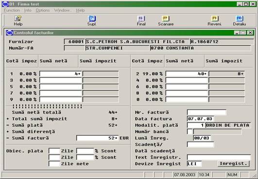 Prin tasta F9 se dechide masca de control facturi, unde se confirma valoare facturii, scadenta, data facturii, modalitatea de plata, etc., se specifica numarul facturii, apoi se tipareste documentul. În avest moment programul cere confirmarea pentru înregistrarea facturii în contabilitate dupa tiparire.