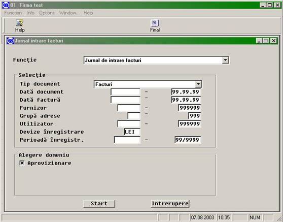Preluarea în contabilitate a facturilor înscrise se face prin tiparirea jurnalului de intrare marfuri (jurnal de cumparari). Acesta se poate realiza odata pentru toate facturile înscise, sau selectiv prin alegerea furnizorului, datei documentului, etc., precum se vede în figura urmatoare: