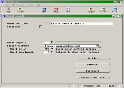 În control comanda (EK0152) avem posibilitatea de a realiza lista comenzilor lansate catre furnizori, având diferite statute (comenzi înregistrate, finalizate, intrare marfuri efectuata, etc.), sub diferite forme, functie de criteriile de sortare si selectie alese. Dupa cum se vede în figura urmatoare, se poate realiza listarea pe ecran, asociind un model de vizualizare, sau listarea la imprimanta, alegând modelul de tiparire (layout). La alegerea criteriilor de sortare si selectie, acestea se pot selecta dintr-o lista apasând tasta F3, dintre variabilele disponibile.