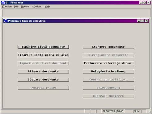 În programul de prelucrare fisier de calculatie (RG372) se realizeaza tiparirea listelor de facturi, listei de cifra de afaceri, cautare, vizualizare, tiparire duplicat si stergere facturi de aprovizionare.