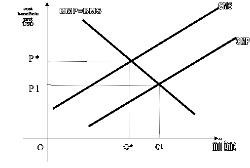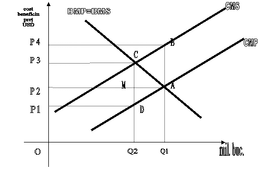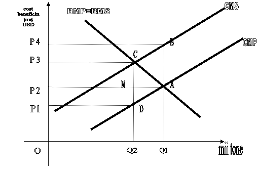 stiind ca OP1 = 15 USD/t; OP3 = 40 USD/t si ca productia optima din punct de vedere privat OQ1 = 10 mil t, iar cāstigul net social este de 5 mil USD, sa se determine :