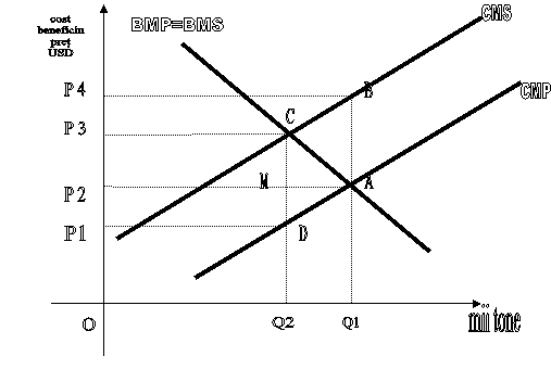 stiind ca OP1 =25 USD/t; OP3 = 50 USD/t si ca productia optima din punct de vedere social OQ2 = 200 mii t, iar cāstigul net social este de 50 mii USD, sa se determine :