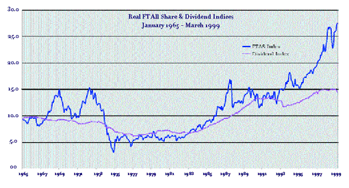 O metoda simplista consta în crearea unui indice al dividendelor care sa aiba o valoare egala cu 100 la începutul perioadei luate în calcul iar ulterior sa creasca periodic cu procentul corespunzator dividendelor acordate.Evolutia indicelui FTA-All Share împreuna cu evolutia indicelui dividende construit conform metodei de mai sus, pe baza datelor din perioada 1965-1999, sunt prezentate în graficul de mai jos:
