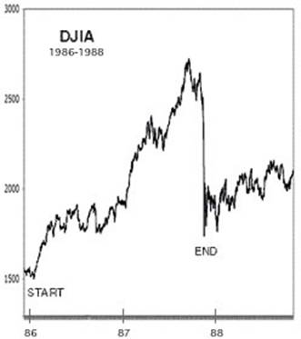 Între 1982 si 1987 piata bursiera a înregistrat o crestere sustinuta , caracterizata prin preluari fortate, cumparari pe credit si formarea de conglomerate.Efectul scontat al acestor operatiuni era considerat ca fiind o crestere exponentiala a companiilor prin simpla cumparare a altor companii. Adesea companiile procedau la emiterea de obligatiuni murdare[4] pentru a obtine sume importante în vederea preluarii companiilor dorite.O alta metoda de finantare devine comuna în acea perioada si anume ofertele publice initiale.De asemenea industria computerelor personale îsi începea trendul ascendent.În aceste conditii publicul investitor a fost cuprins de o "euforie contagioasa" similara cu cea a oricarei bule speculative sau prabusiri bursiere din istorie.Aceasta euforie a facut investitorii sa creada înca o data ca piata va creste continuu si la infinit.La începutul anului 1987 Securities and Exchange Comission a condus numeroase investigatii asupra investitiilor ilegale facute de asa numitii insideri .Aceasta a aruncat o umbra de incertitudine asupra bursei , investitorii devenind circumspecti. Datorita cresterii economice sustinute ,inflatia începea sa devina o preocupare.Banca Centrala a procedat la cresterea ratei dobânzii pe termen scurt, aceasta având însa efecte negative asupra preturilor bursiere.Multi investitori institutionali au început sa apeleze la contractele futures pentru a se proteja, piata futures absorbind miliarde de dolari într-o perioada foarte scurta, creând instabilitate pe piata bursiera.Aditional , majoritatea investitorilor obisnuiti doreau sa lichideze pozitiile detinute, numarul mare de ordine de vânzare ajungând sa blocheze sistemele informatice ale bursei new-yorkeze.Majoritatea investitorilor chestionati ulterior doreau sa vânda doar pentru ca toti ceilalti o faceau.Aceasta mentalitate irationala a condus însa la prabusirea bursei new-yorkeze.Într-o singura zi piata a pierdut 500 miliarde de dolari capitalizare bursiera.Spre deosebire de crahul bursier din 1929 piata si-a revenit repede transformându-se înca o data într-o piata de tip bullish.