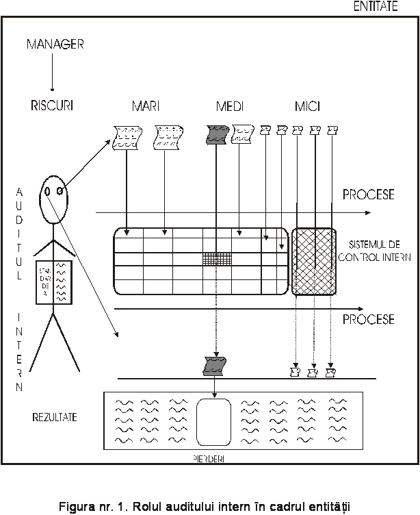 In Romania, auditul intern a fost adoptat ca un termen la moda in domeniul controlului financiar, insa cu timpul s-a reusit decantarea conceptelor de control intern si audit intern. In prezent, exista o problema cu intelegerea sistemului de control intern, care fiind obiect al auditului intern, inglobeaza toate activitatile de control intern realizate in interiorul unei entitati si riscurile asociate acestora, asa cum rezulta din Figura nr. 1 - Rolul auditului intern in entitatile publice.