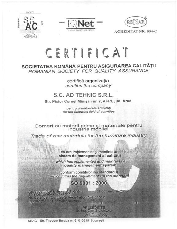 Anexa 2. Certificat ISO 90001:2000 pentru implementarea si mentinerea unui sistem de management al calitatii al SC. AD TEHNIC SRL eliberat de SRAC