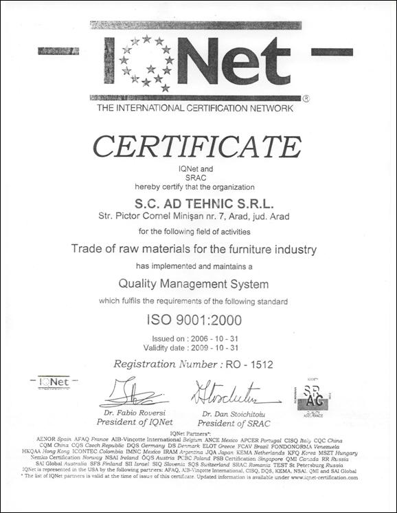 Anexa 3. Certificat ISO 90001:2000 pentru implementarea si mentinerea unui sistem de management al calitatii al SC. AD TEHNIC SRL eliberat de IQNet