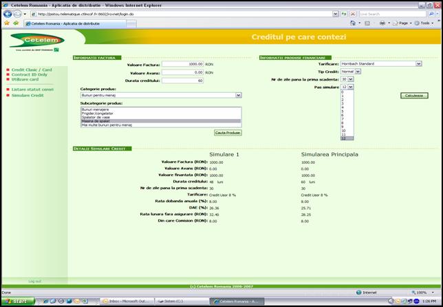 Campul PAS SIMULARE permite sistemului sa genereze o contraoferta. Selectand un numar de la 0 la 12, ecranul va afisa doua simulari ale aceleiasi valori, dar pe perioade de timp diferite. Astfel, daca ati selectat 12, pe ecran se va afisa SIMULAREA PRINCIPALA, conform perioadei alese initial de catre client si SIMULARE 1 care afiseaza perioada diminuata in functie de numarul de luni ales in campul destinat PAS SIMULARE.