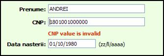 Toate campurile aplicatiei sunt obligatoriu de completat. In cazul in care s-a sarit peste un camp obligatoriu, aplicatia va afisa un mesaj de atentionare. Daca datele introduse sunt eronate, aplicatia va afisa din nou un mesaj de atentionare.