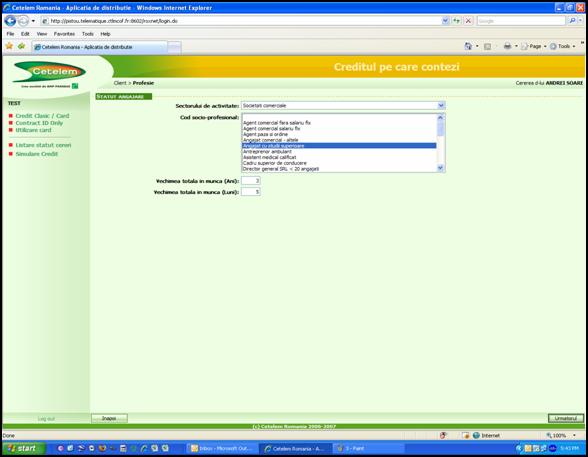 Ecranul de mai jos face referire la profesia solicitantului de credit. Se va selecta sectorul de activitate si codul socio-profesional.