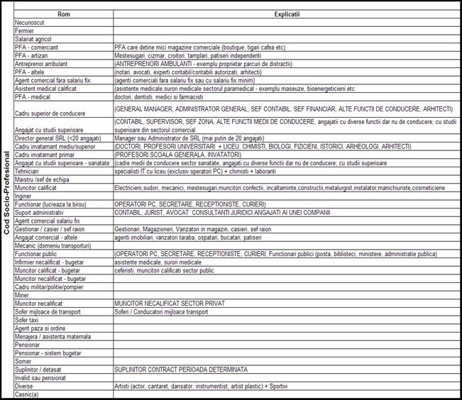 Atentie: Codul socio profesional "DIVERSE" este menit in principal pentru tipurile de ocupatii descrise in tabelul codurilor Socio Profesionale (ex. Artisti sau Sportivi). Folosirea codului "DIVERSE" in mod repetat (mai ales pentru partener) fara a se incerca incadrarea aplicantului in unul din celelalte coduri socio profesionale existente poate denatura in mod nejustificat pozitia financiara a aplicantului sau a familiei sale, cu implicatii asupra deciziei de credit.