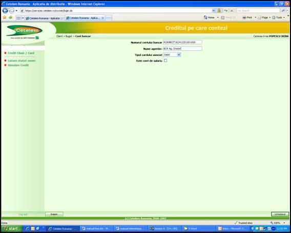 Ultimul ecran ce trebuie completat va contine date asupra contului bancar al clientului, numele agentiei unde clientul are contul deschis si daca exista un card atasat acestui cont.