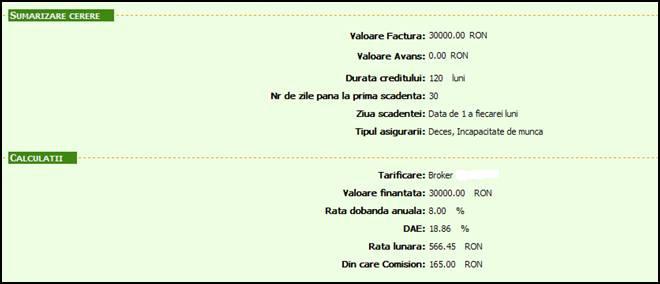 acest ecran se pot vizualiza informatiile finale ale creditului (dobanda, rata, DAE, perioada de creditare,