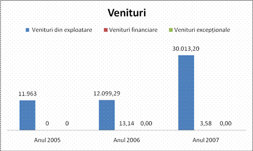 Ponderea cea mai mare in total venituri au reprezentat-o venituri din exploatare, astfel in anul 2005 cu un procent de 100%,in 2006 cu un procent de 99,89% si 2007 cu un procent de 99,99%. O pondere aproape nesemnificativa in total venituri au reprezentat-o venituri financiare pentru anii 2006 cu un procent de 0,11% si in anul 2007 cu un procent de 0,01%.