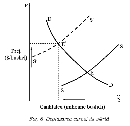 Se poate observa ca în locul curbei SS a aparut o noua curba a ofertei, SISI, care este rezultatul reducerii cantitatii de grâu vândute si al cresterii pretului. Curba SS se va deplasa de-a lungul curbei DD în sus, nu numai când productia de cereale va fi compromisa, ci si atunci când guvernul ia masuri de limitare a productiei cu ajutorul diferitelor pârghii (guvernul acorda premii în bani pentru pamântul necultivat s.a.). În consecinta, daca se produce o cantitate mai mica de grâu sau porumb, atunci pretul acestor produse va fi mai mare si consumatorul va asigura prin pretul platit un venit suplimentar producatorului. Curba de oferta se poate deplasa si spre dreapta atunci când cantitatea de grâu vânduta creste, iar pretul scade.