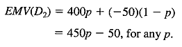 Calculul valorii monetare asteptate a deciziei D2 este mai greu. Aici sunt doua rezultate posibile si, pentru a efectua calculul antreprenorul are nevoie sa cunoasca probabilitatile celor doua rezultate. Sa notam cu p probabilitatea de reusita a noului produs. Atunci, (1- p) este probabilitatea ca el sa esueze. Astfel, valoarea monetara asteptata a lui D2 este data de expresia: