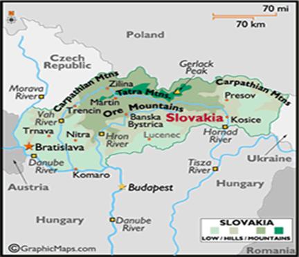 Pozitia geografica. Slovacia face parte din categoria stat 12112f53m elor central-europene având ca vecini în Nord Polonia (517,7 km), Est Ucraina (196 km), Vest Austria (68 km) si Cehia (488 km4), Sud Ungaria (608 km). Teritoriul Slovaciei se desfasoara pe cca 2ș latitudine (între 49ș31Ž lat. N - localitatea Oravska Polhora si 47ș45Ž lat. N - localitatea Martonkut) si 6ș longitudine (localitatea cea mai vestica este Gajary 16ș56Ž long. E, iar cea mai estica este Ulio la 252ș26Ž long. E).