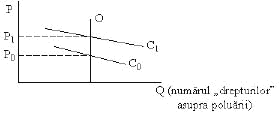 · comercializarea drepturilor asupra poluării. Dacă societătile functionează în conditii legale, pe bază de licente de productie, există automat si un asa numit drept al acestora să polueze până la un anumit nivel, într-un anumit loc si pe o perioadă dată de timp. Aceste licente fac obiectul vânzării-cumpărării, deci si dreptul de a polua poate fi comercializat. Prin mecanismele pietei, adică raportul cerere-ofertă si nivelul pretului, guvernele determină limita suportabilitătii poluării din punctul de vedere al securitătii sociale. Oferta acestor drepturi asupra poluării este perfect rigidă, dar prin comercializarea lor, pretul poate creste dacă există agenti economici care consideră mai avantajos să cumpere dreptul asupra poluării decât să investească în actiuni de diminuare a ei (figura nr. 5), ceea ce înseamnă o crestere a cererii pentru aceste licente.