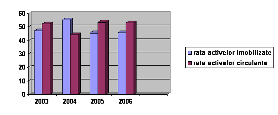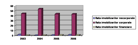 In situatia analizata se observa ca cea mai mare pondere din totalul imobilizarilor in activul bilantier o detin imobilizarile corporale. Se constata o scadere a imobilizarilor necorporale de la 1 % in 2004 la 1,30% in 2006. Rata imobilizarilor corporale inregistreaza o crestere vertiginoasa de la 44,78% in anul 2003 la 54,46% in 2004, dupa care se observa scaderi semnificative ajungand in anul 2005 la 43,78%. Relatiile financiar patrimoniale externe ale firmei sunt foarte restranse, astfel rata imobilizarilor financiare are o pondere de sub 1% din totalul activului bilantier al firmei.