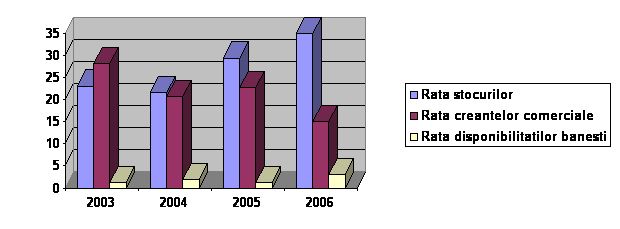 Rata stocurilor a crescut intr-o proportie insemnata de la 23.05% in anul 2003 la 34.83% in anul 2006 datorata cresterii valori absolute a stocurilor cat si a cresterii ponderii activelor circulante in structura activului. Se inregistreaza o scadere a ratelor creantelor comerciale in totalul activelor circulante de la 28.1% in anul 2003 la 15.08% in anul 2006. Cresterea ratei disponibilitatilor de la 1.15% in anul 2004la 3.09% in anul 2006 arata o consolidare a lichiditatilor si solvabilitatii financiare, precum si o inbunatatire a rentabilitatii monetare a unitatii.