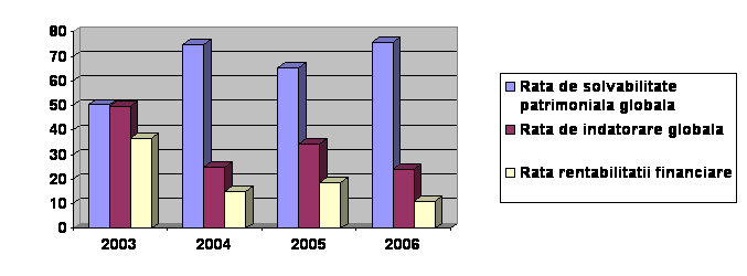 Se constata ca rata de solvabilitate globala inregistreaza fluctuatii semnificative intre 50.35% in 2003 si 75.82% in anul 2006 cand se observa cea mai mare valoare a capitalurilor propii, iar in ceilalti ani inregistrandu-se scaderi sau cresteri bruste. Rata de indatorare globala este in scadere de la 49.65% in anul 2003 la 24.18% (la sfarsitul anului 2006), aceasta scadere semnificand faptul ca firma si-a achitat obligatiile.Analizand evolutia ratei rentabilitatii financiare intre intervalul de timp 2003-2006 se observa o scadere a acestei de la 36.62% in 2003 la 11.09 in 2006. In anul 2005 se observa ca situatia se schimba intr-o oarecare masura , respectiv s-au inregistrat cresteri din nou la 18.8, fata de 2004 cand se observa o rata de 15.07%.