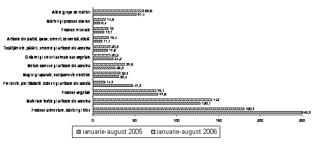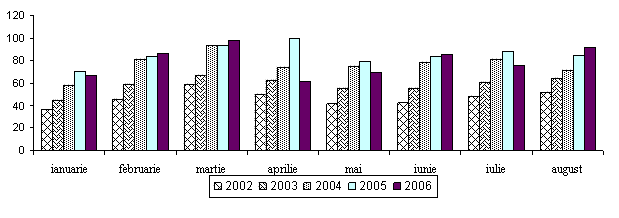 Unii din factorii care au condus la diminuarea fluxurilor comerciale spre exterior au fost, in special, lipsa contractelor de lunga durata la exportul marfurilor si dependenta sporita fata de regimul comercial al tarilor importatoare. Intre timp, acesti factori au condus la crearea unei situatii in care nu exista o gama diversificata si competitiva de produse exportate, precum si dependenta livrarilor de un numar de piete reduse. Ca rezultat, avem trei grupe de marfuri cu ponderea cea mai mare in export total, dintre care doar materialele textile si articolele din acestea se caracterizeaza printr-o evolutie pozitiva, in timp ce produsele alimentare, bauturi si tutun si produsele vegetale au o tendinta total inversa, cauzele acestei evolutii fiind dezvoltarea insuficienta a acestor ramuri. Evolutia lunara a importului in ianuarie-august 2002-2006, mil. dolari SUA