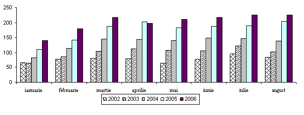 Sursa: Biroul National de Statistica Evolutia lunara a exportului in ianuarie-august 2002-2006, mil. dolari SUA