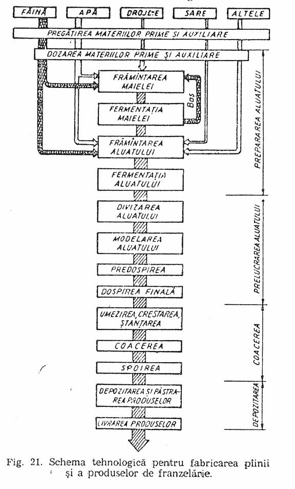 Tehnologia fabricarii painii si produselor de franzelarie (cornuri, chifle, impletituri etc.) reprezinta baza panificatiei, care se completeaza cu fabricarea produselor speciale, produselor dietetice si covrigilor. Produsele se obtin prin coacerea unui aluat format din faina, drojdie, sare, apa - ca materii prime - si alte materii, cum ar fi grasimi zahar, lapte, oua - ca materii auxiliare. Procesul tehnologic de fabricatie cuprinde un ansamblu de faze si operatii, datorita carora se obtine aluatul, din care, prin coacere, in urma transformarii materiilor utilizate la prepararea lui, rezulta produse destinate consumului. Prepararea, prelucrarea si coacerea aluatului reprezinta fazele de baza ale obtinerii produselor de panificatie. Schema tehnologica pentru fabricarea painii si a produselor de franzelarie este prezentata in figura 21.