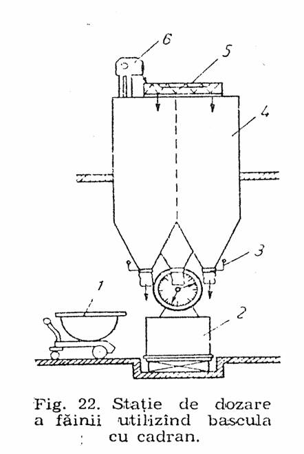 Bascula ca cadran reprezinta mijlocul cel mai simplu pentru cantarirea fainii. Ea se utilizeaza in unilatile mici si mijlocii, montandu-se intr-un anumit loc, in sala de preparare a aluatului si constituind stasina de dozare a fainii (fig. 22). Pentru dozare, cuva 1 in care urmeaza a se prepara aluatul se aduce pe platforma basculei 2, se stabileste greutatea initiala si apoi se deschide subarul 3 al timocului de faina 4 ce deserveste statia de dozare, lasand sa curga cantitatea necesara. Faina se aduce la timoc cu ajutorul melcului transporter 5 si elevatorului 6. In cazul cand se fabrica produse din mai multe sorturi de faina, pentru fiecare sort trebuie sa existe un timoc aparte. Dupa cantarire, cuva se transporta la malaxor. Acest procedeu de dozare necesita multe manipulari si eforturi sporite din partea muncitorului framintator.