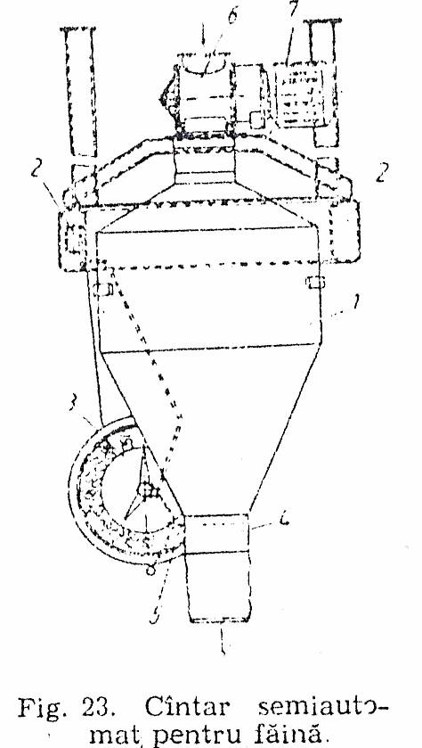 Circularul semiautomat se utilizeaza in fabricile mari. El reprezinta un mijloc perfectionat care, pe de o parte, asigura precizia dozarii, iar pe de alta usureaza munca lucratorului la framantare. Acest cantar (fig. 23) se compune dintr-un rezervor 1, in care se primeste faina, sprijinit pe un sistem de caqntarire cu pirghii 2. Cantitatea de faina cantarita se citeste pe cadranul gradat 3 prevazut cu sistem de fixare si indicare a dozei necesare de cantarit. Rezervorul de cantarire are in partea inferioara o gura de evacuare 4, care se inchide si se deschide cu subarul 5. Alimentarea cu faina se face prin intermediul unci ecluze 6 actionata de motorul electric 7.