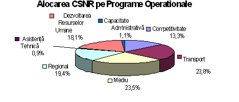 Tabelul financiar al CSNR prezinta defalcarea pe Programe Operationale a sumei totale corespunzatoare contributiei Fondurilor Structurale din cadrul Obiectivului Convergenta si Fondului de Coeziune, care se ridica la suma totala de 19,213 miliarde Euro. Figura nr. 1 ilustreaza aceasta alocare.