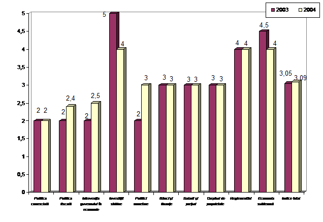 In anul 2004 Republica Moldova a urcat pe pozitia a 79-a din 155 in topul tarilor dupa indicele libertatii economice prognozat. Tara noastra insa continua sa fie inclusa in categoria tarilor cu economii „relativ libere”. Republica Moldova se plaseaza dupa Bulgaria si Sri Lanka, dar devanseaza Albania, Brazilia si Croatia. Moldova este inclusa intr-un grup cu Azerbaijan, Rusia, Ucraina si Kazahstan, care insa se afla cu mult in urma. Romania este plasata pe locul 129.