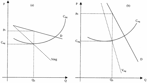 În acest caz, noua curba a costului marginal, Cmg1, intersecteaza curba venitului marginal, Vmg, la dreapta lui pcQc si Qm >Qc iar pm < pc.