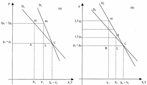 unde: pi este pretul bunului i, Cmgi este costul marginal al bunului i, EDi este elasticitatea cererii bunului si α este o constanta. Rezulta ca preturile R.B. respecta regula: distantele relative dintre preturile diverselor bunuri si costurile lor marginale sunt invers proportionale cu elasticitatea în functie de pret a cererii care le este adresata. Asa construite, preturile R.B. nu numai ca acopera integral costul de productie, dar diminueaza si pierderea de bunastare, care este în acest caz LCM pentru bunul X si BCH pentru bunul Y. Prin intermediul acestor preturi, pierderea de bunastare este mai mica decât în cazul anterior.