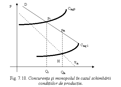 Analiza anterioara este schematica; nu exista nici un motiv pentru a presupune ca nu are loc o modificare a conditiilor de cost. Trecerea la monopol poate sa determine aparitia economiilor de scara si din aceasta sa rezulta o crestere a productiei si reducerea preturilor (fig. 7.18).