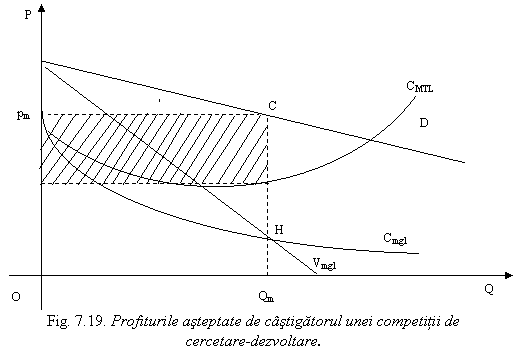 Profiturile anuale nete ale firmei ce câstiga competitia sunt πm - - r, unde πm reprezinta profitul de monopol înaintea deducerii cheltuielilor de cercetare-dezvoltare (venitul total) si "r" reprezinta cheltuielile anuale pentru cercetare-dezvoltare. În fig. 7.19, D reprezinta curba cererii, CmgL este costul marginal pe termen lung, CMTL este curba costului total mediu pe termen lung si VmgL este curba venitului marginal pe termen lung.