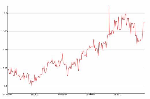 Graficul nr. 2: Evolutia valutara a monedei DST în raport cu USD la cursul BNR pe perioada: 01.05.2007 - 31.12.2007