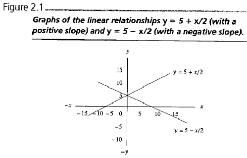 Putem îmbunatati întelegerea intuitiva a unei relatii functionale prin reprezentarea sa grafica, astfel încât ea sa poata fi vizualizata. Într-un grafic, valorile variabilei independente sunt uzual înscrise pe axa orizontala si valorile variabilei dependente sunt uzual reprezentate pe axa verticala. Fiecare punct din reteaua de linii corespunde unei perechi de valori pentru variabile. Ca exemplu, vezi Figura 2.1. Dreapta cu panta crescatoare din grafic reprezinta toate perechile de valori care satisfac functia y = 5 + x/2. Puteti verifica aceasta gasind un cuplu de puncte care trebuie sa fie pe dreapta care corespunde acestei functii. De exemplu, daca y = 0? Ce valoare ar trebui sa aibe x? Daca y = 0, atunci o aritmentica simpla va releva ca x este egal cu - 10. Astfel, perechea (0, -10) este un punct p edreapta definita de functie. Dar daca x = 0? Ce valoare va avea y? În acest caz, al doilea termen din partea dreapta a ecuatiei dispare, astfel ca y = 5. Astfel, perechea de valori (5, 0) este un punct pe dreapta definita de catre functie.